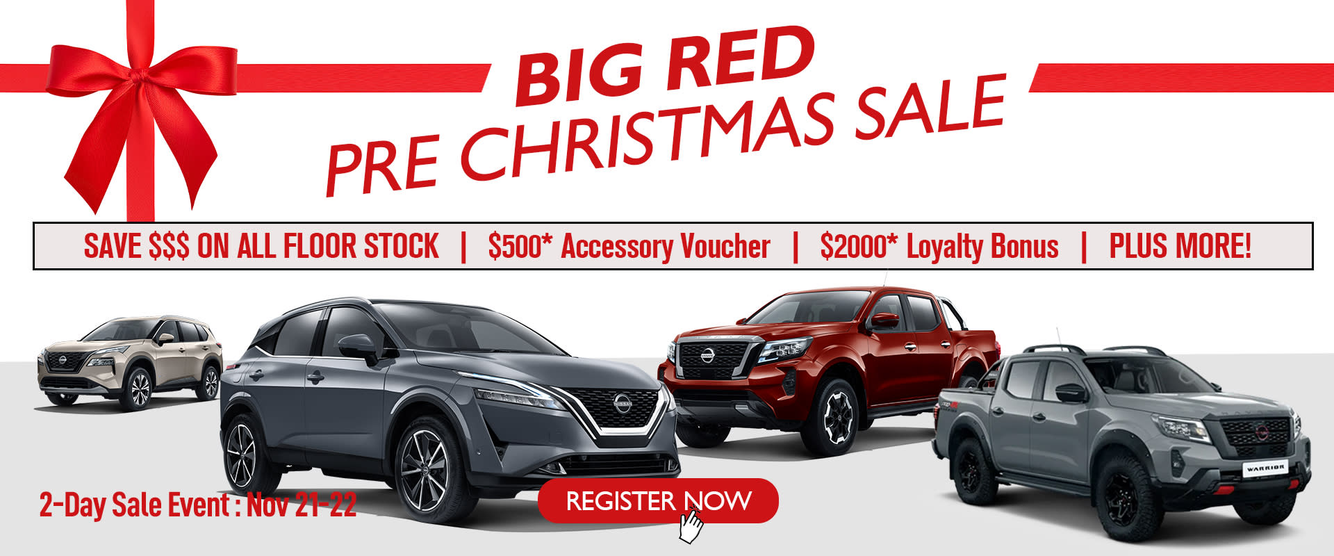 *Terms & Conditions: The Big Red Sale runs from 8:30 AM Friday, November 21st to 5:30 PM Saturday, November 22nd, 2025, with all offers valid only during this period. Offers apply to new and demonstrator Nissan models (Navara, X-TRAIL, Patrol, QASHQAI, JUKE, and Pathfinder) and cannot be combined with other promotions or previous purchases. A $2,000 loyalty bonus applies to verified returning customers only, and a $500 accessory voucher can be used towards aftermarket or genuine accessories. Stock is limited and available on a first-come, first-served basis. Free gifts are included with every purchase while supplies last and are not redeemable for cash. Vehicles must be purchased during the event and delivered before November 30, 2025, to qualify. Tweed Coast Nissan reserves the right to modify or cancel the event without notice.