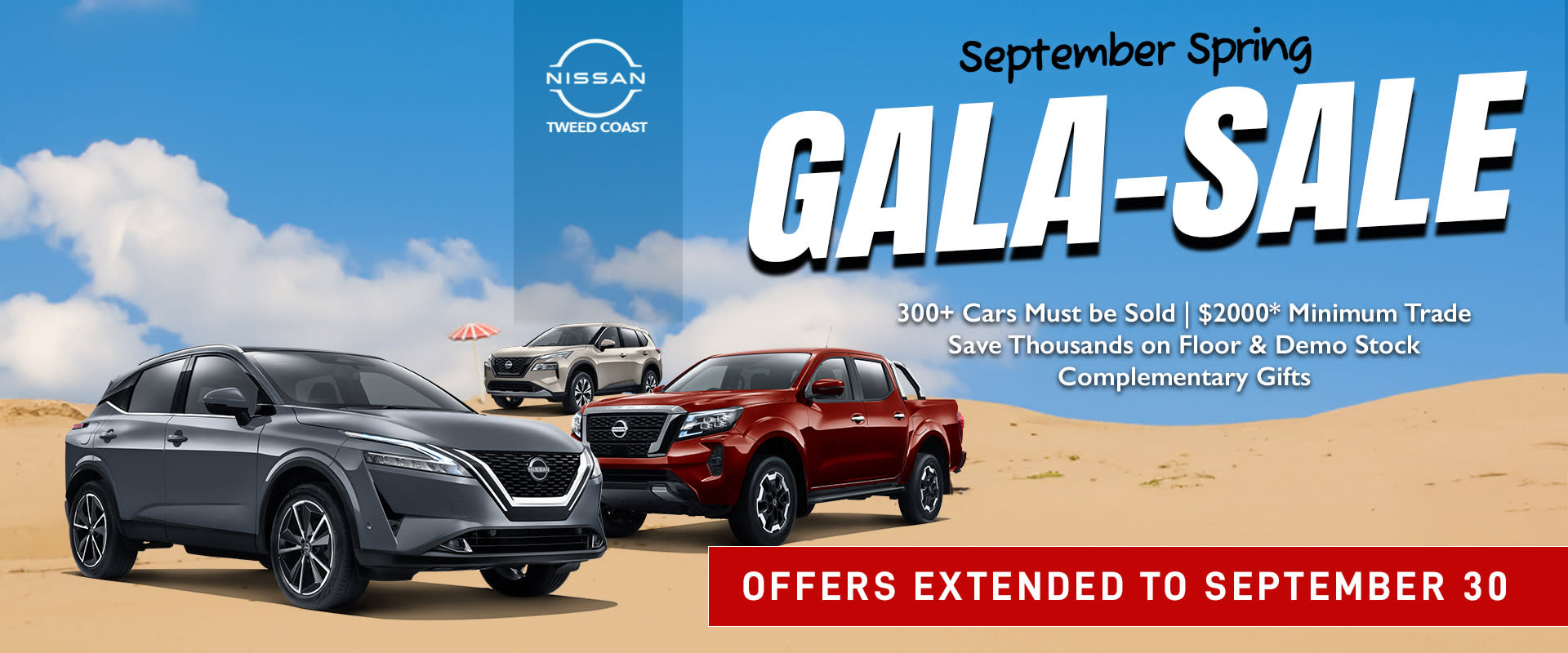 * Terms & Conditions: The September Spring Gala Sale runs from 8:30 AM Friday, September 19th to 5:30 PM Saturday, September 20th, 2025, with all offers valid only during this period. Offers apply to new and demonstrator Nissan models (Qashqai, Patrol, Navara, X-Trail) and cannot be combined with other promotions or previous purchases. $2,000 minimum trade-in is available on registered, roadworthy vehicles that are not repairable write-offs; final trade value is at the dealer’s discretion. A $2,000 trade/loyalty bonus applies to verified returning customers only. Stock is limited and available on a first-come, first-served basis. Free gifts are included with every purchase while supplies last and are not redeemable for cash. Test drives are available during the event and limited to short routes. Tweed Coast Nissan reserves the right to modify or cancel the event without notice.